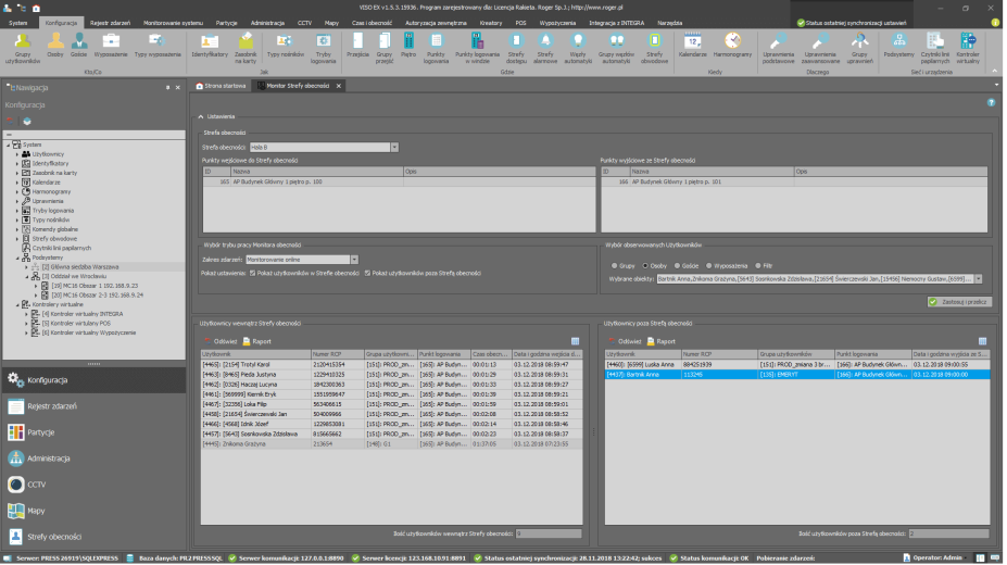 - raportowanie czasu obecności użytkowników w dowolnie definiowanych obszarach systemu