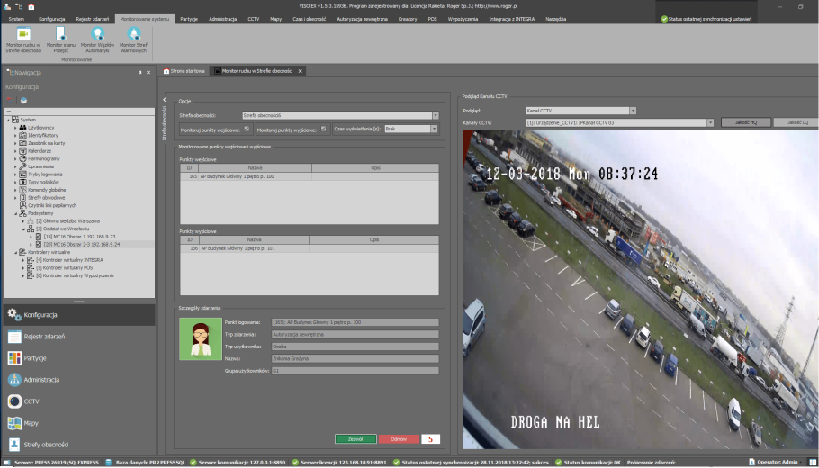 - monitorowanie wybranych przejść z podglądem wideo